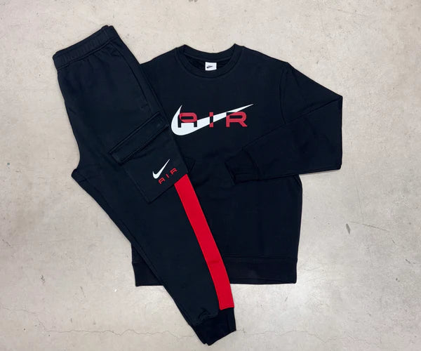 Nike Swoosh Air Full Tracksuit Mens Colour: Black/Red Material: 80% Cotton 20% Polyester Cargo Style Pant Cuffed Bottoms Draw-cord Waist...