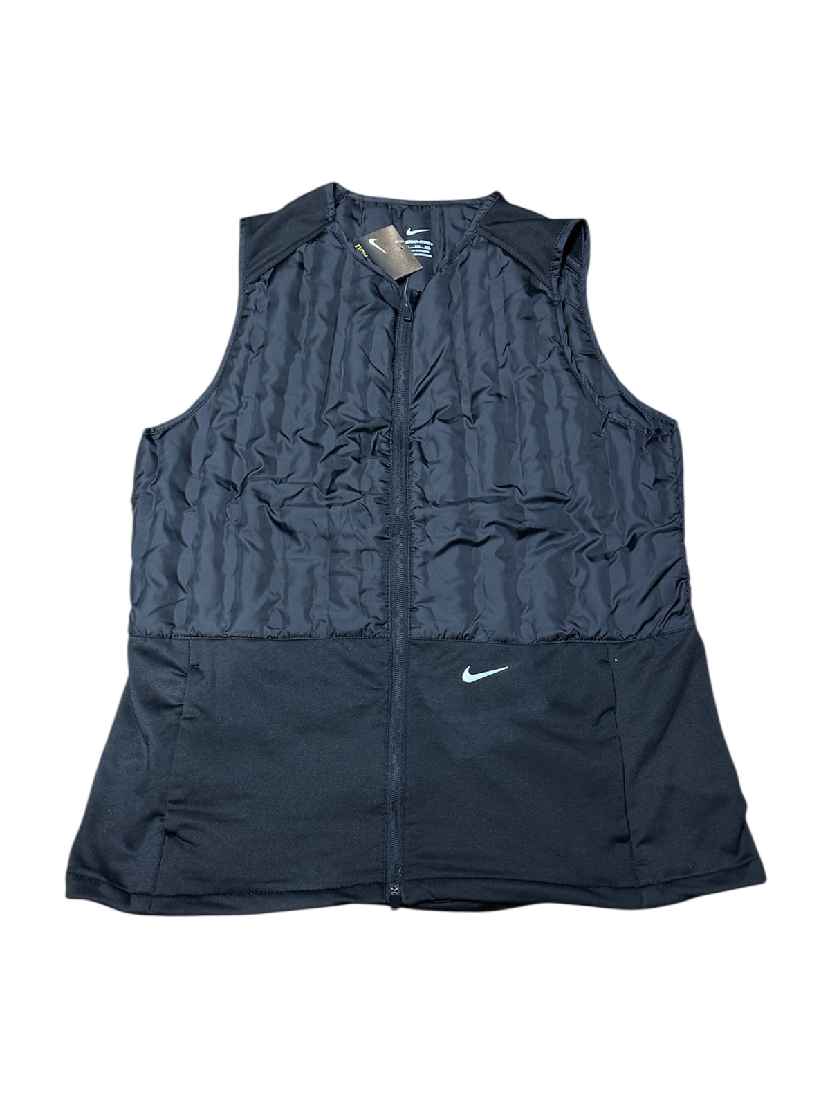 Featuring Nike Therma-FIT technology, the gilet helps to manage your body's natural heat to ensure that you keep warm in cold-weather conditions. Combined with a woven, water-repellent fabric, the top ensures comfortable wear that helps keep you dry in light rain and snow. Synthetic insulation throughout the gilet offers excellent warmth and features perforations for optimal breathability. With a new take on an icon, the Nike Running Gilet features a special stitching technique that nods to the Windrunner's chevron design. A mock neck design helps keep extra warmth in and can be zipped to the top using the full-length zip. This zip also allows you to control airflow. Lastly, zippered hand pockets allow you to stash small items securely while you run.