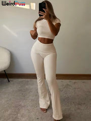 Weird Puss Casual Women Tracksuit 2piece Set Solid Short Sleeve Crop Tops+Flare Pants Skinny Elastic Matching Streetwear Outfits