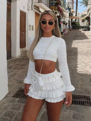 Chic Solid Knitted Shorts Sets Women Ruffled Long Sleeve Cropped Pullover High Waist Shorts.