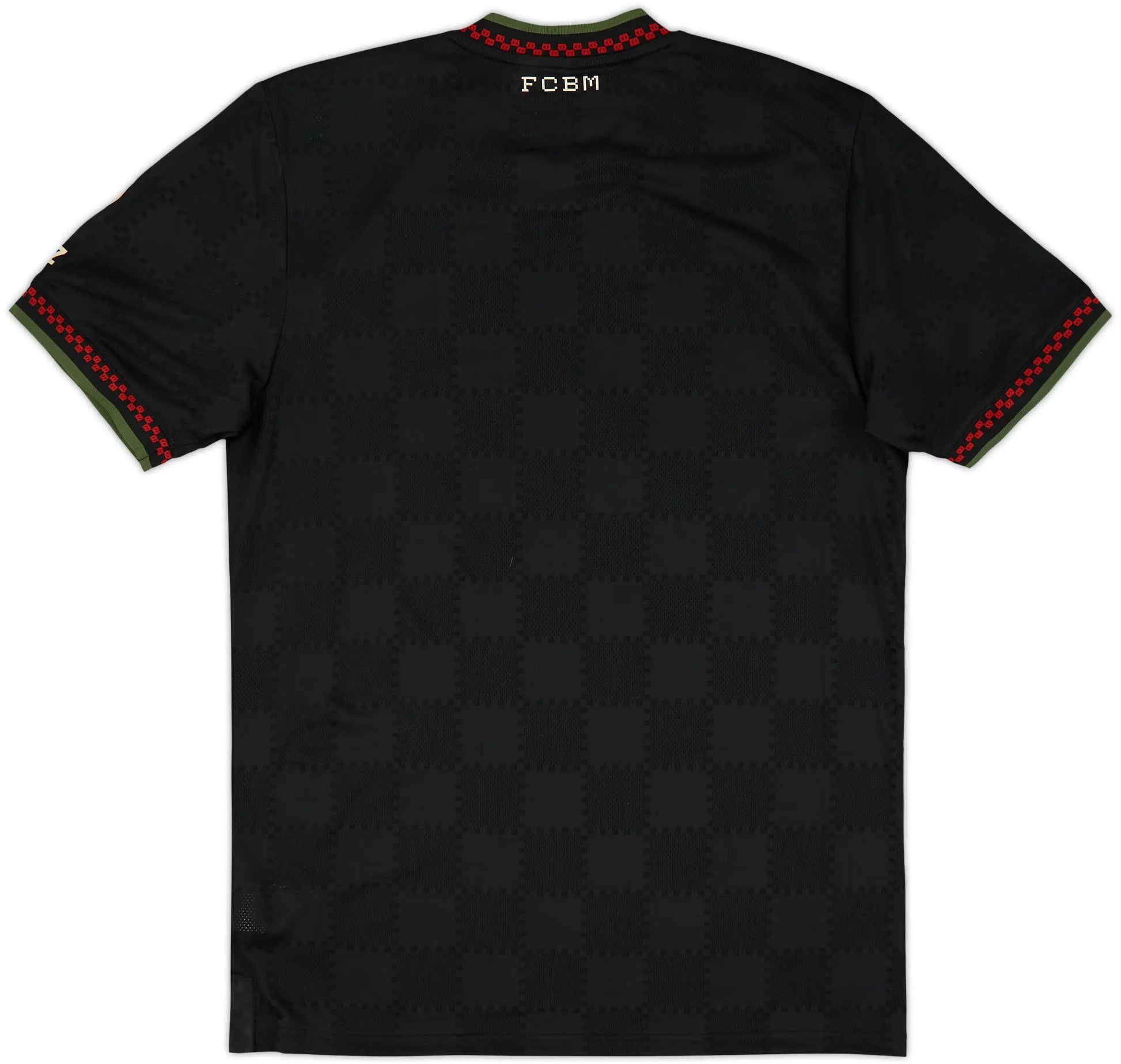 A sleek, predominantly black third shirt for Bayern’s 2025‑26 season, featuring off‑white Trefoil logos, a subtle serrated-checkered print, khaki-trimmed collar and cuffs with red-checked edging, and “FCBM” rendered in matching check-pattern font—a bold Adidas × BSTN collab that blends urban style with Bavarian edge