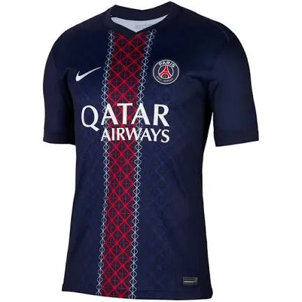 Rep your side's badge with pride in this men's Paris Saint Germain 25/26 Home Kit from Nike. In the iconic Midnight Navy, the latest design has a University Red and White paint brush stripe down the front of the shirt. It features a classic crew neckline and short sleeves for unrestricted movement, while sweat-wicking Dri-FIT tech has been added to the polyester fabric for cool comfort. With the France flag to the nape, this shirt is finished off with the Swoosh and the PSG crest on the chest. Machine washable. | Our model is 6'1" with a 39" chest and wears a size medium.